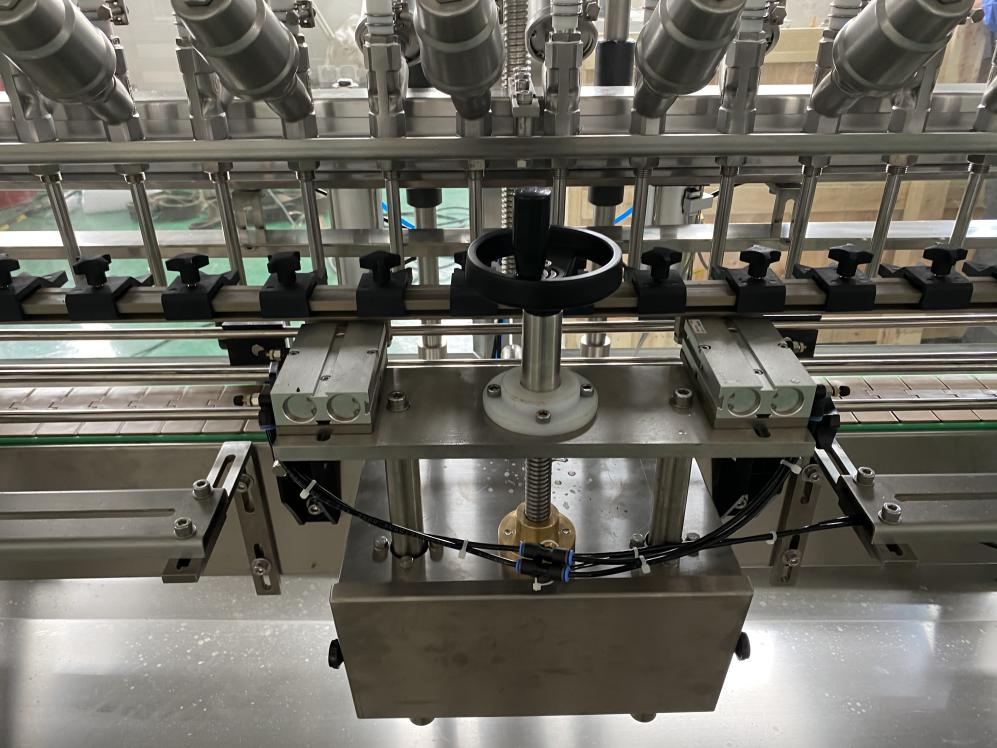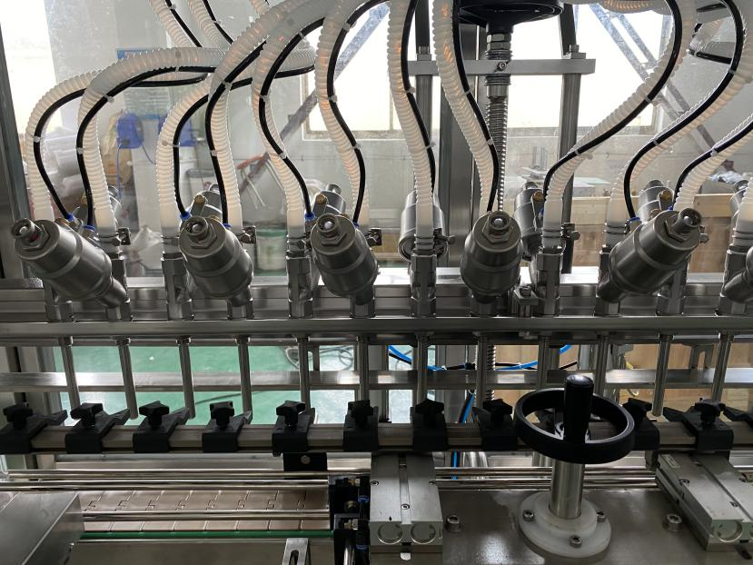 The valves are connected with the material pipes, and hand wheel is to adjust the heights of filling heads.
