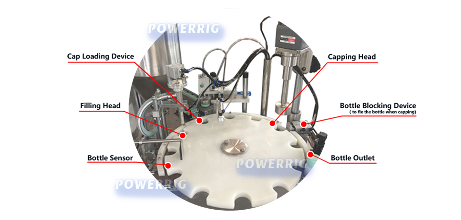 The equipment is divided into a turntable into the bottle, automatic lift filling, automatic pre-spin cover, servo capping, a few bottles, such as the operation of the bottle into the bottle, filling the bottle, filling the bottle, and then the bottle capping operation.